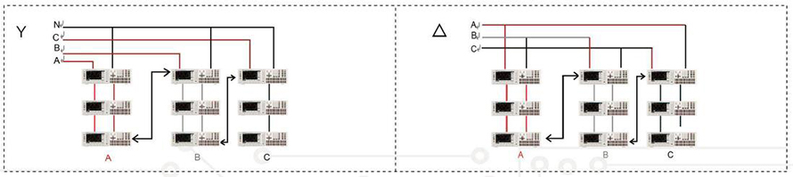 IT8600提供多臺(tái)并聯(lián)、三相與并聯(lián)三相的功能,可以實(shí)現(xiàn)對(duì)于三相交流電源或者大功率電源的測(cè)試應(yīng)用。在三相并聯(lián)應(yīng)用中,用戶可以根據(jù)實(shí)際需求實(shí)現(xiàn)Y型和Δ型的連接方式,進(jìn)行自由靈活的搭配。IT8600還可以實(shí)現(xiàn)交流380V的輸入,通用,多元的測(cè)試需求。