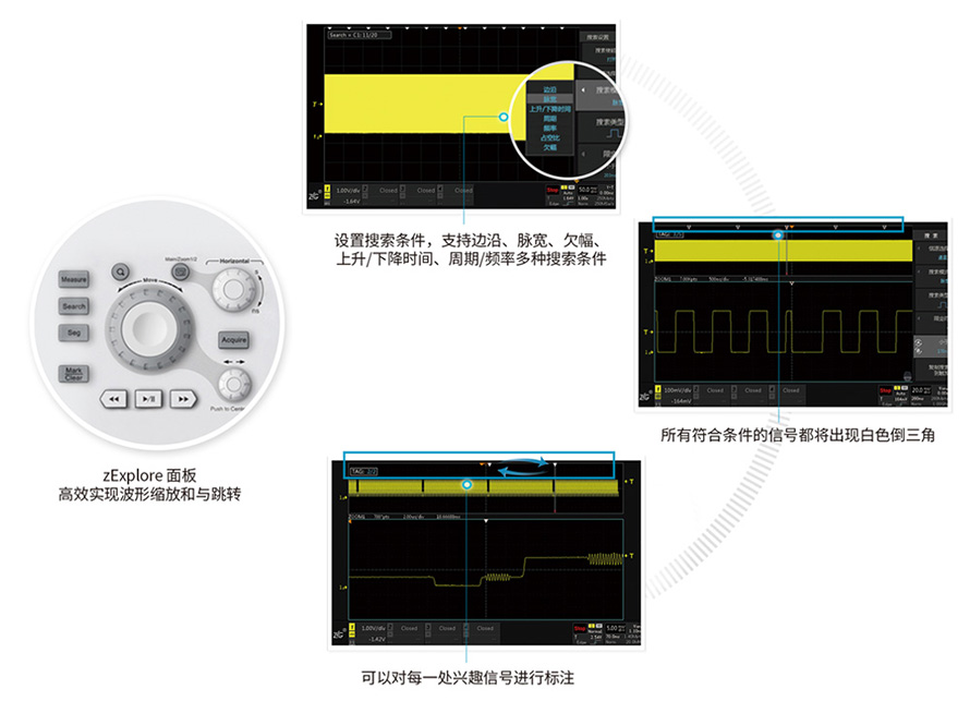 ZDS4000系列示波器不只提供了512M的波形大數(shù)據(jù),還配有強(qiáng)大的波形搜索功能和智能標(biāo)注功能。您可以先通過(guò)邊沿、脈寬、欠幅、上升/下降時(shí)間、周期/頻率等多種搜索條件來(lái)定位512Mpts波形數(shù)據(jù)中的異常點(diǎn),再對(duì)找出的異常信號(hào)使用標(biāo)注功能,對(duì)異常信號(hào)進(jìn)行標(biāo)注。這里,所有的測(cè)量都是經(jīng)過(guò)FPGA全硬件加速,整個(gè)過(guò)程1S左右即可完成。再對(duì)找出的異常信號(hào)使用標(biāo)注功能,對(duì)異常信號(hào)進(jìn)行標(biāo)注。