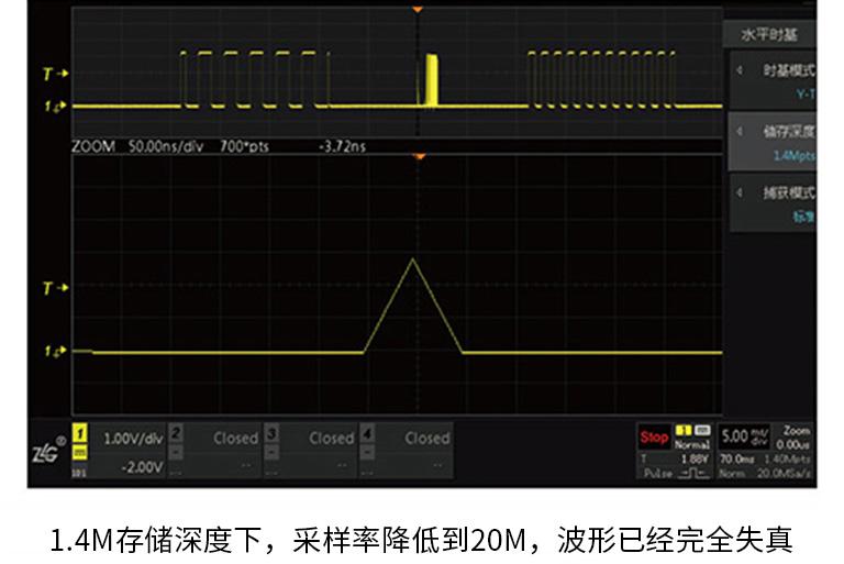 如果存儲(chǔ)深度能夠做到足夠大,就能保持較高的波形采樣率,則觀察到的波形會(huì)真實(shí)、細(xì)膩。反之,如果存儲(chǔ)深度只有1Mpts甚至低,當(dāng)要觀察時(shí)長較大的波形時(shí),示波器就只能被迫降低采樣率。由于采樣點(diǎn)數(shù)不足,示波器顯示的波形也會(huì)嚴(yán)重失真,甚至產(chǎn)生波形混疊,誤導(dǎo)用戶測量分析。ZDS3000/2000B系列示波器創(chuàng)新性地采用DDR3存儲(chǔ)技術(shù),配合大規(guī)模的FPGA器件,通過全硬件加速和多線程并行處理,存儲(chǔ)深度高可達(dá)250M !在觀察長時(shí)間波形時(shí)也不丟失波形細(xì)節(jié)。