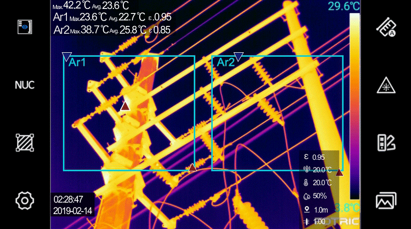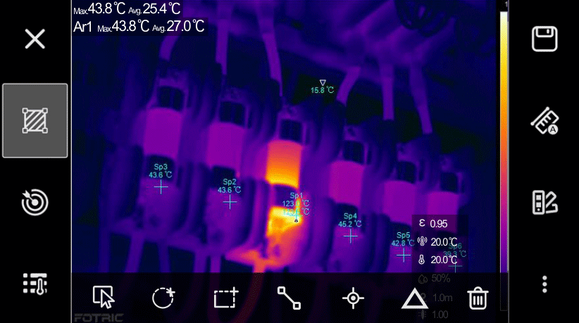 同時支持高低溫自動捕捉,本機可添加25個測溫點、25個測溫區(qū)域與25條測溫線同時測量。